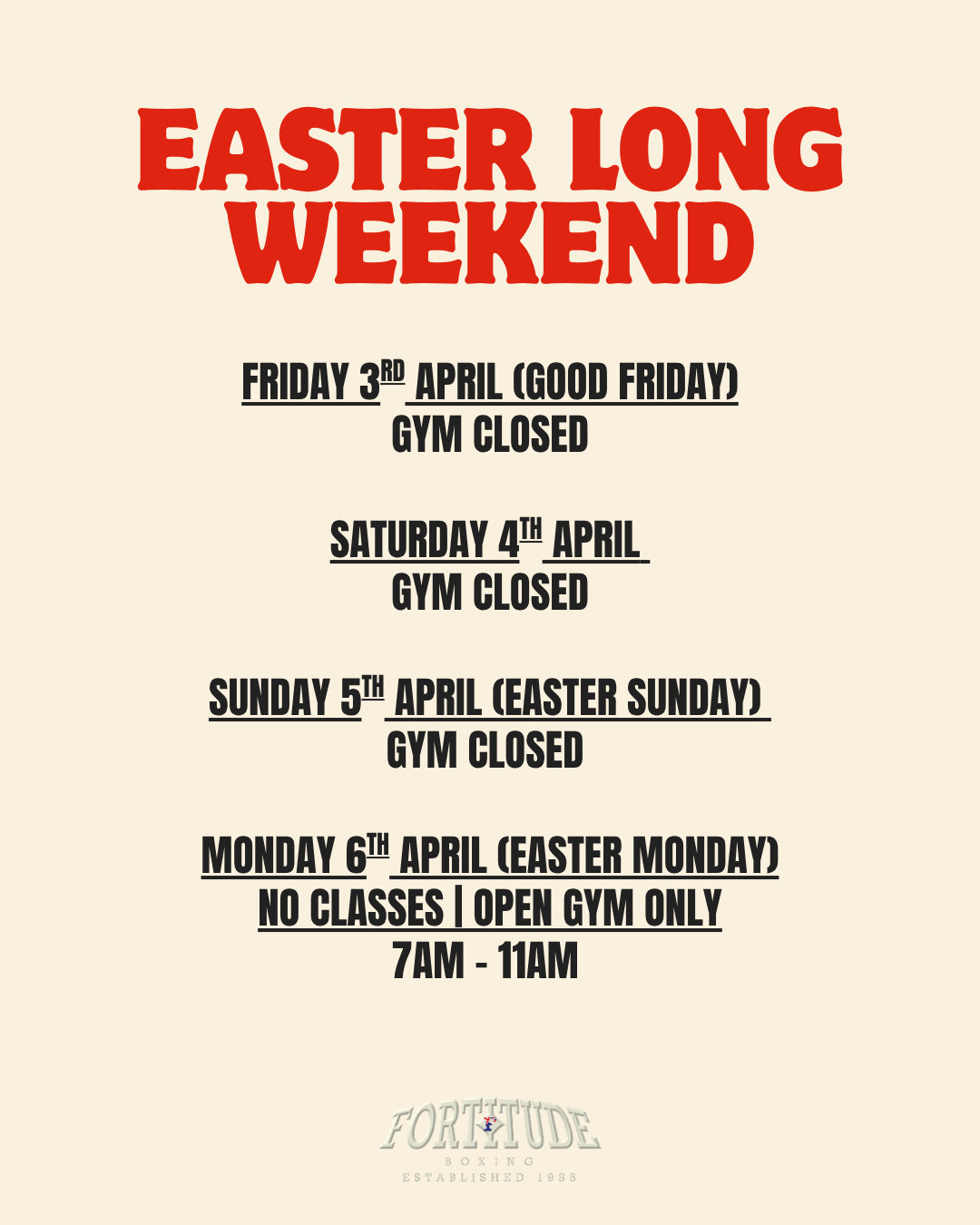 Easter Long Weekend Gym Houra